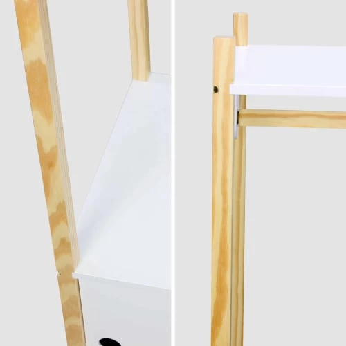Cette penderie est le meuble parfait pour ranger les petits vêtements de votre enfant. Son design mixte et sobre plaît à tous grâce au blanc et au bois de pin naturel massif. Votre enfant pourra grandir dans sa jolie chambre sans jamais se lasser de ses jolis meubles. La penderie est divisée en plusieurs parties afin d’optimiser l’espace de rangement. Au-dessus, se trouve une étagère ouverte pour poser quelques objets ou vêtements et en-dessous une étagère fermée grâce aux deux portes coulissantes, où vous pourrez ranger des affaires sans qu’elles soient visibles.