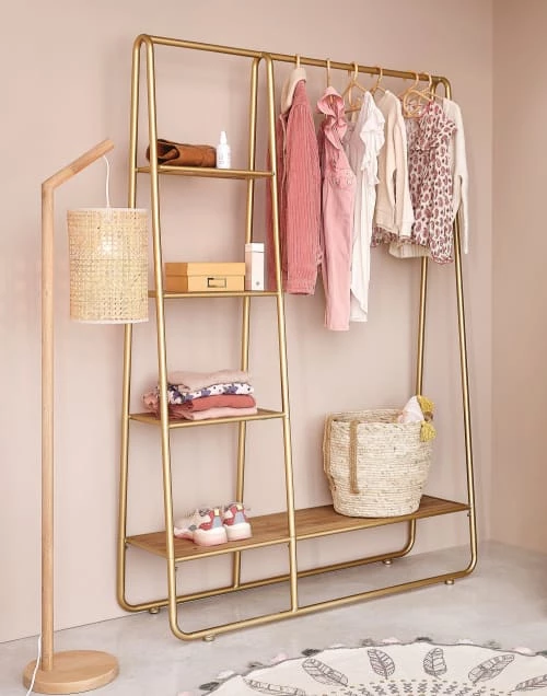 Le portant en sapin et métal coloris laiton YSEE trouvera-t-il sa place dans la chambre de votre enfant ? Plein d’élégance, ce meuble saura se rendre indispensable au quotidien. D’un côté, vêtements pliés et de l’autre, des cintres permettront de suspendre manteaux, vestes et robes. Grâce à l’étagère située au bas de ce portant, les chaussures pourront également y être rangées. Difficile de lui résister !
