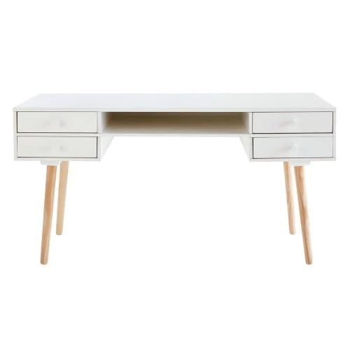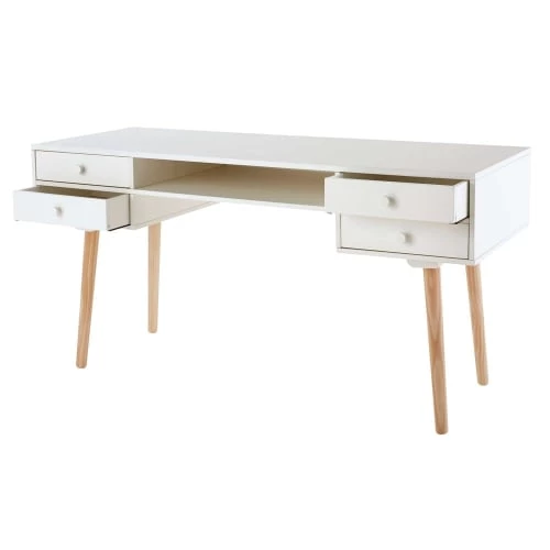 Faire ses devoirs ne sera plus une corvée avec le bureau 4 tiroirs blanc JOY, dont le design sobre et tendance fera l’unanimité auprès des plus jeunes ! On craque pour le design scandinave de ce bureau blanc, dont les pieds obliques rendent subtilement hommage au style vintage. Sous le plateau de ce bureau, vous trouverez une large niche ainsi que quatre petits tiroirs indispensables pour dissimuler livres et cahiers. Égayez ce coin bureau par une petite chaise colorée !