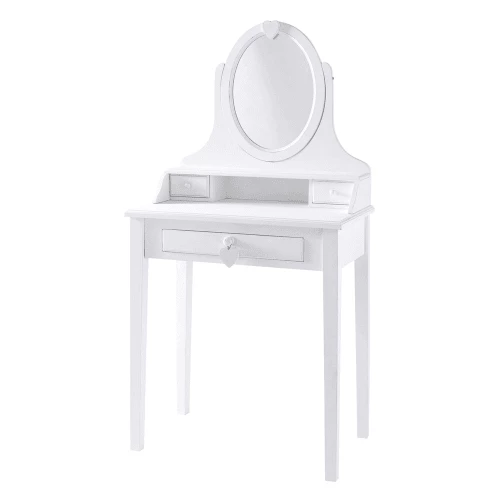 Avec la charmante coiffeuse 3 tiroirsblanche VALENTINE, votre princesse a elle aussi le droit à son petit coin beauté. Orné d’un joli miroir, cette coiffeuse dispose également de petits tiroirs pour ranger des accessoires ou du maquillage. On craque pour ses petits coeurs qui apportent une note romantique au meuble.