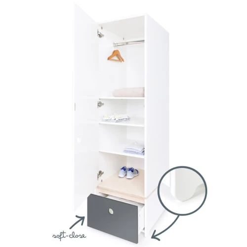 L’armoire enfant 1 porte COLORFLEX est équipée d’une grande porte et d’un tiroir, séparés par une planche de contreplaqué de bouleau. Le système de fermeture “Soft Close”, doux et silencieux, assure un maximum de confort et de sécurité.