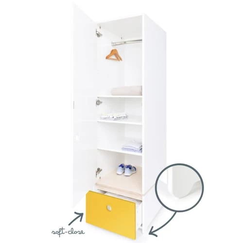 L’armoire enfant 1 porte COLORFLEX est équipée d’une grande porte et d’un tiroir, séparés par une planche de contreplaqué de bouleau. Le système de fermeture “Soft Close”, doux et silencieux, assure un maximum de confort et de sécurité.