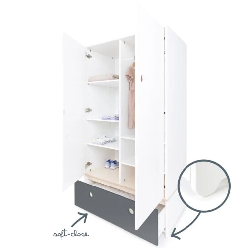 L’armoire enfant 2 portes COLORFLEX est équipée de deux grandes portes et d’un tiroir, séparés par une planche de contreplaqué de bouleau. Le système de fermeture “Soft Close”, doux et silencieux, assure un maximum de confort et de sécurité.