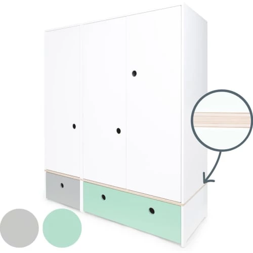 L’armoire enfant 3 portes COLORFLEX est équipée de 3 grandes portes et de 2 tiroirs, séparés par une planche de contreplaqué de bouleau. Le système de fermeture “Soft Close”, doux et silencieux, assure un maximum de confort et de sécurité.