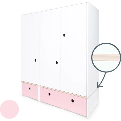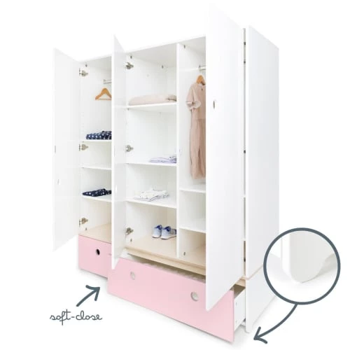 L’armoire enfant 3 portes COLORFLEX est équipée de 3 grandes portes et de 2 tiroirs, séparés par une planche de contreplaqué de bouleau. Le système de fermeture “Soft Close”, doux et silencieux, assure un maximum de confort et de sécurité.
