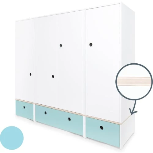L’armoire enfant 4 portes COLORFLEX est équipée de 4 grandes portes et de 3 tiroirs, séparés par une planche de contreplaqué de bouleau. Le système de fermeture “Soft Close”, doux et silencieux, assure un maximum de confort et de sécurité.